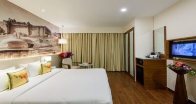 The hotel’s Deluxe Rooms have been tastefully done up with walls depicting the region’s rich art and culture. Calming interiors, pastel décor, and soothing lights give the room a pleasing effect. It has facilities such as comfortable beds.